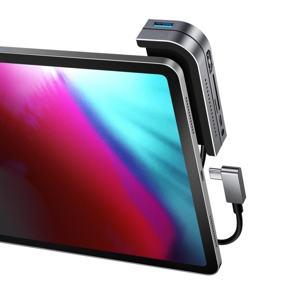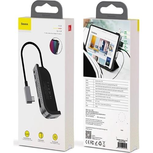 iPad için özel olarak tasarlanan, Type-C bağlantı noktasına sahip bilgisayarlar ve mobil cihazlarda da kullanılabilen Baseus Bend Angle Çok Fonksiyonlu Type-C Hub, bir Type-C bağlantı notkasını 1xUSB 3.0, 4K görüntü çıkışını destekleyen 1xHDMI, 1xSD kart okuyucu, 1xSD kart okuyucu, 1x 3.5 mm Stereo ve 60W güç dağıtımını destekleyen Type-C PD çıkışlarına dönüştürür.